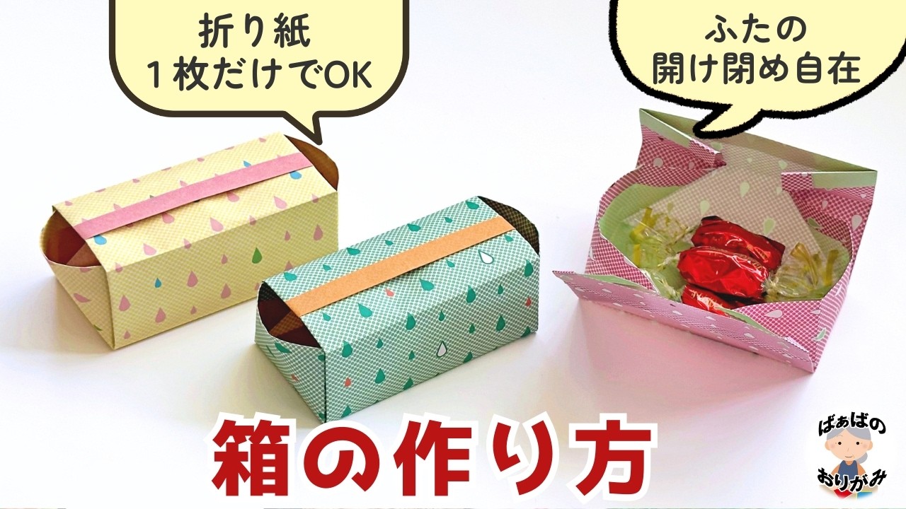 | タイトル | 折り紙1枚で 開け閉めできるふた付き箱の作り方 Origami box with lid【音声解説あり】 / ばぁばの折り紙 |
